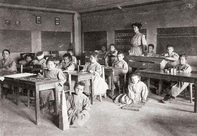 A képen Maria a tanítványaival az általa létrehozott első oktatási épületben: Casa dei Bambini (Gyermekek Háza) Forrás: Baan Dek